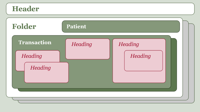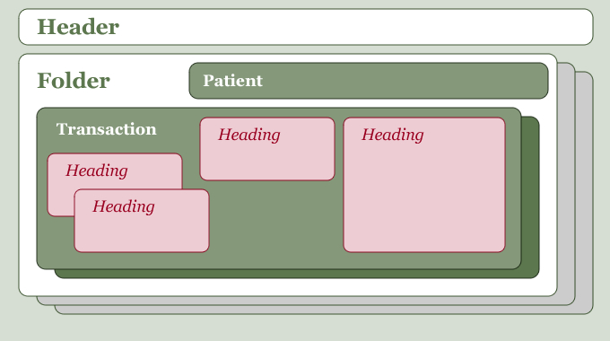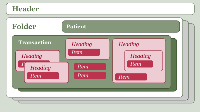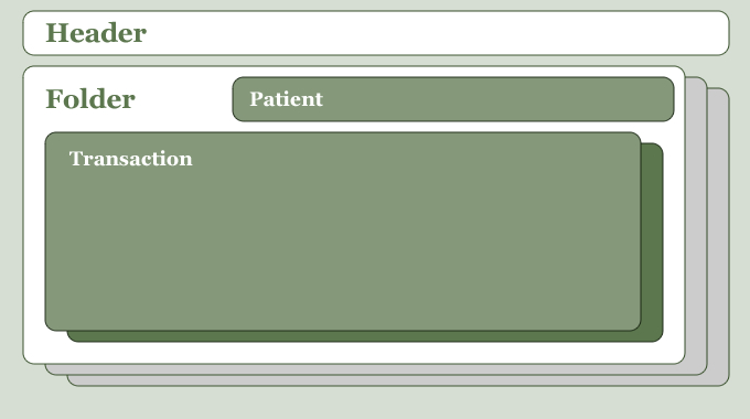Each folder identifies the subject of care (patient) and contains at least one medical transaction.